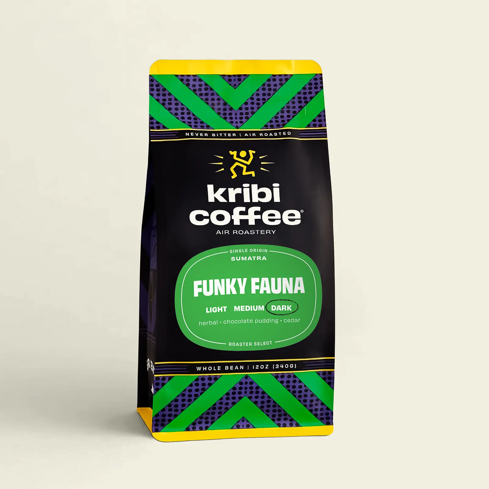 Bold, earthy, and unmistakably Sumatran. This recommended dark roast delivers a rich, complex cup with deep notes of herbal spice, chocolate pudding, and cedar. Grown in North Sumatra’s highlands, Funky Fauna captures the wild character of its origin—raw, untamed, and full of soul.